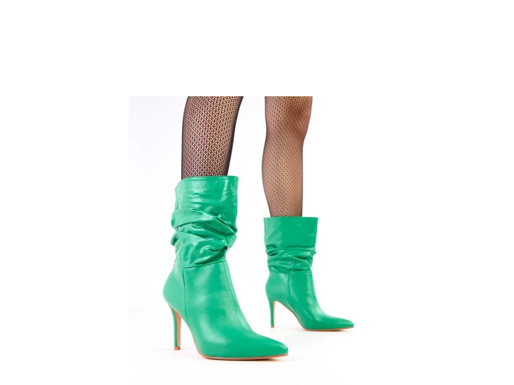 Boty na podpatku s ozdobným záhybem na svršku jsou model, který spojuje eleganci s módním akcentem. Vyrobena z ekologické kůže, působí stylově a efektně, a svršek o výšce 21,5 cm s decentními záhyby přitahuje pozornost a dodává botám výjimečný charakter. Štíhlý, špičatý nos dodatečně zdůrazňuje jejich ženský design. Podpatek ve tvaru podpatku o výšce 9,5 cm zjemňuje postavu a přidává sebejistotu, a díky natahovací konstrukci jsou boty praktické a rychlé na obouvání. Měkká textilní stélka zajišťuje pohodlí nošení, a výška pod kotníkem znamená, že se skvěle hodí jak k elegantním, tak každodenním stylizacím.