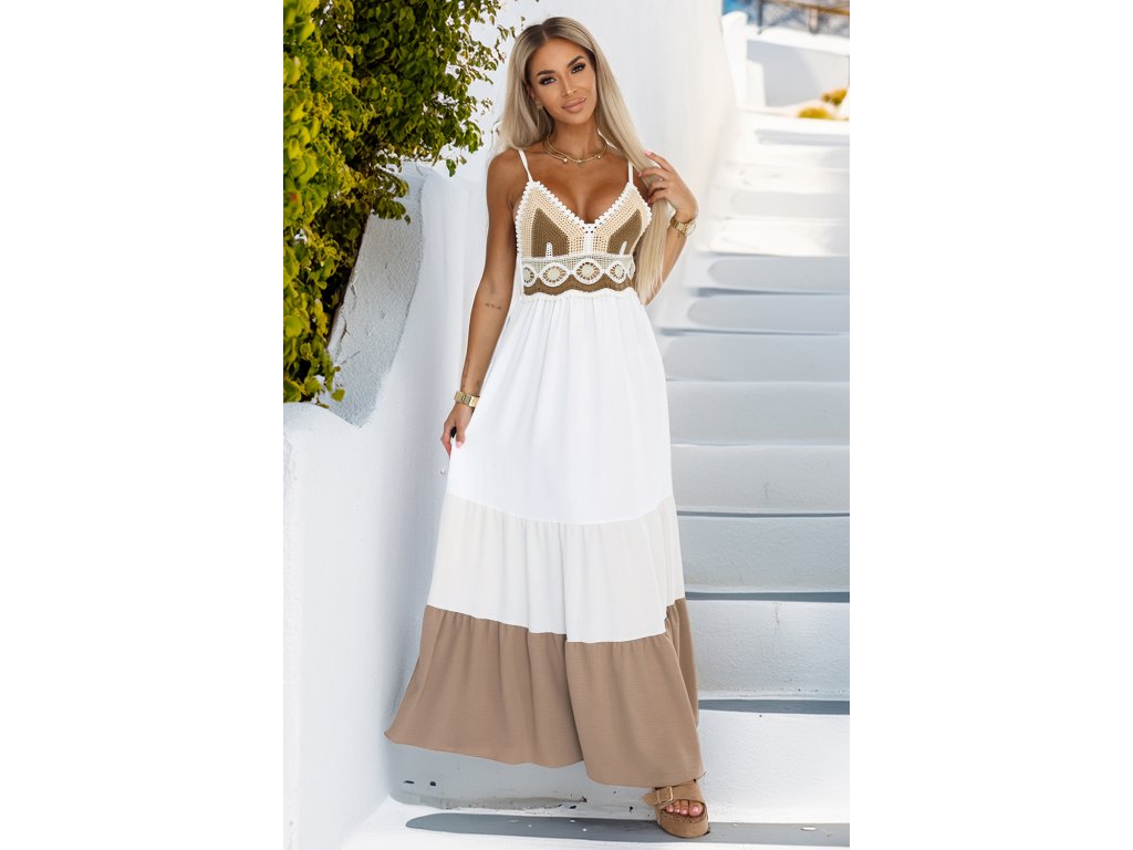 Elegantní a ženské maxi šaty v módním boho stylu z kolekce Numoco Basic jsou ideální volbou na léto, dovolenou a každodenní nošení. Horní část vyrobená z dekorativní háčkované látky v odstínech béžové a bílé decentně zdůrazňuje siluetu, zatímco tenká ramínka dodávají lehkost a romantický charakter. Dlouhá, lehce vzdušná sukně se krásně pohybuje a poskytuje pohodlí i v horkých dnech. Tyto šaty se skvěle hodí na pláž, procházku, letní večírek nebo festival.