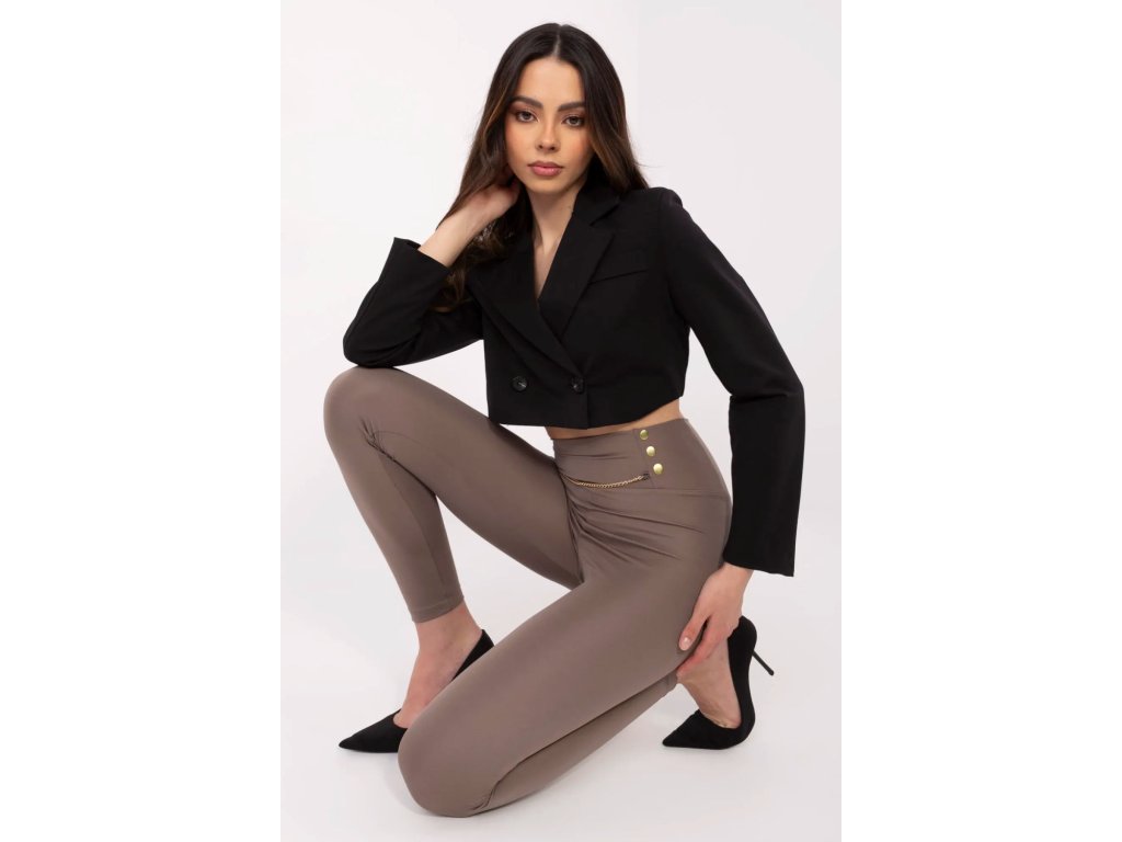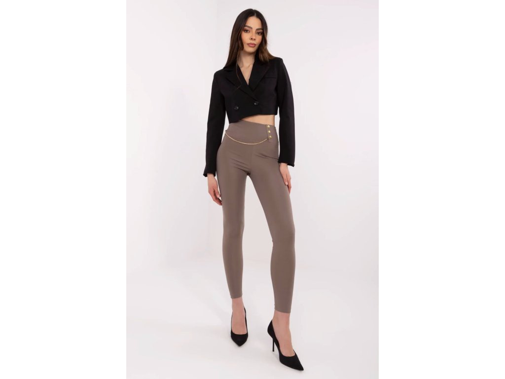 Elegantní legíny s dlouhými nohavicemi pro ženy, ideální jak do každodenního nošení do práce, tak i na večírek. Vyrobené z elastického materiálu z kombinace polyesteru a elastanu, zaručují perfektní přiléhání k postavě a pohodlí po celý den. Model s hladkým vzorem a se zužujícími se nohavicemi krásně zdůrazňuje tvary, a vysoký pas zajišťuje skvělé přiléhání v oblasti pasu a dodatečný pocit pohodlí. Bez kapes a zapínání mají legíny čistý a moderní střih. Jemným, ale zároveň efektním prvkem je ozdobný řetízek, který celku dodává eleganci a dělá z legín skvělý kousek i pro více společenské stylizace.