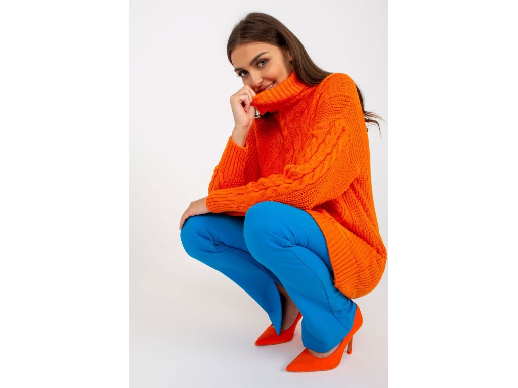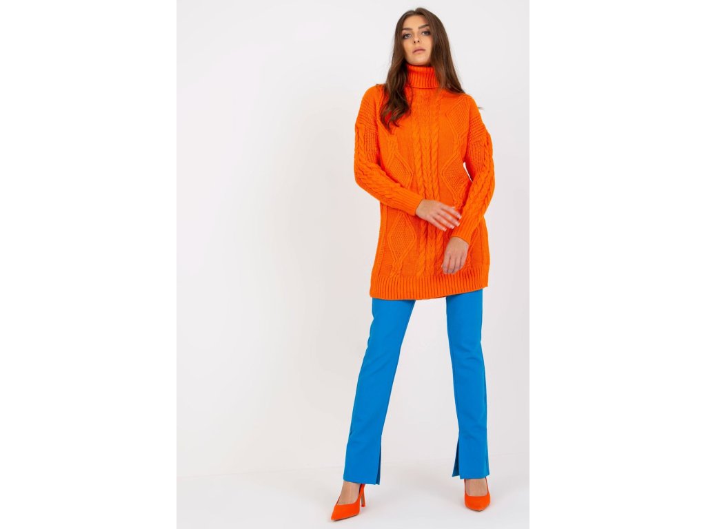 Dámský svetr prodlouženého střihu s rolákem a dlouhými rukávy.