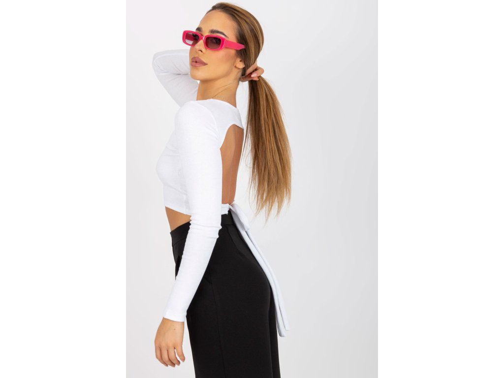Krátká halenka se zajímavým střihem a dlouhými rukávy. Na zadní straně má halenka výřez a vázání.