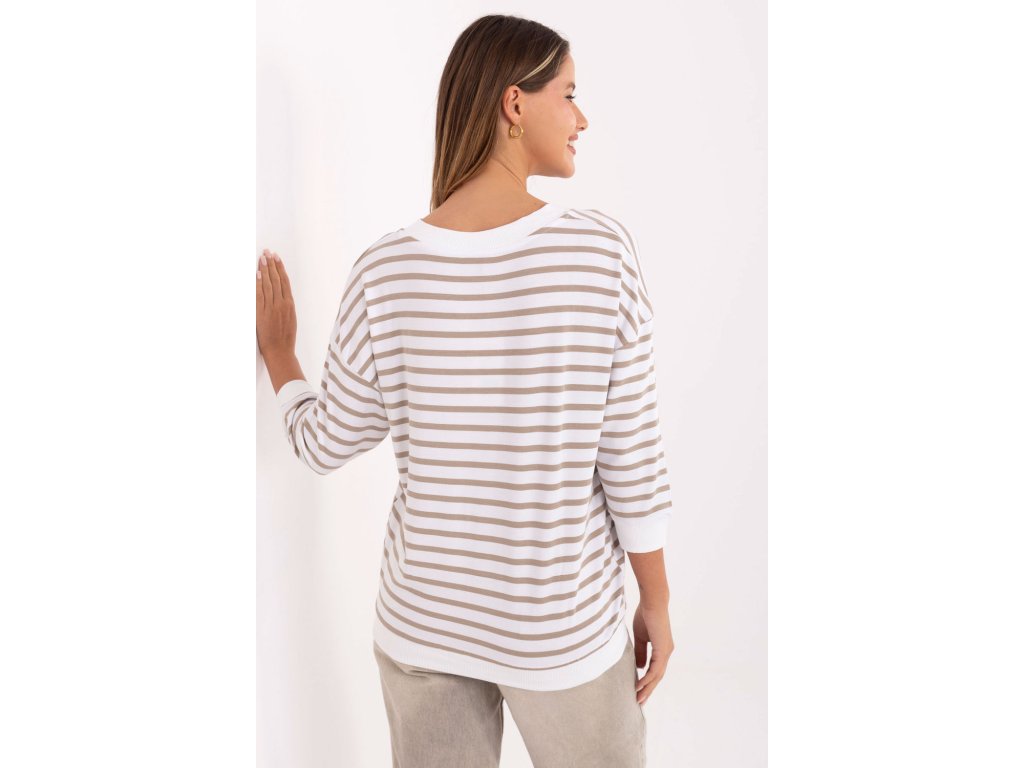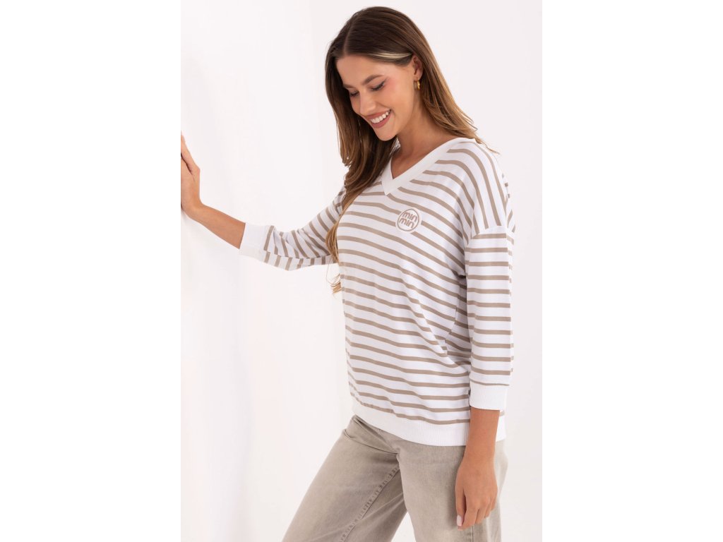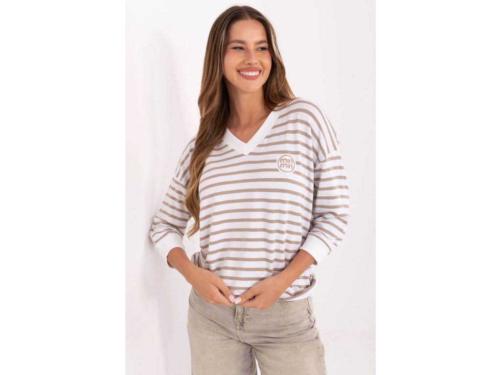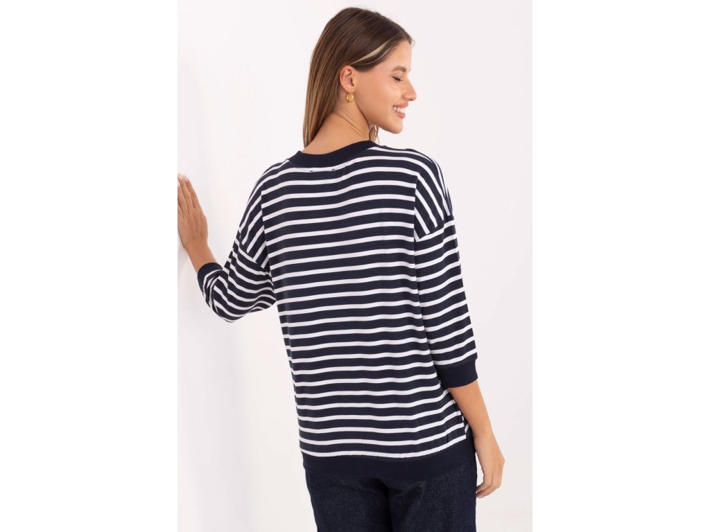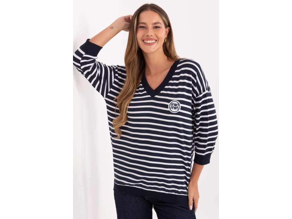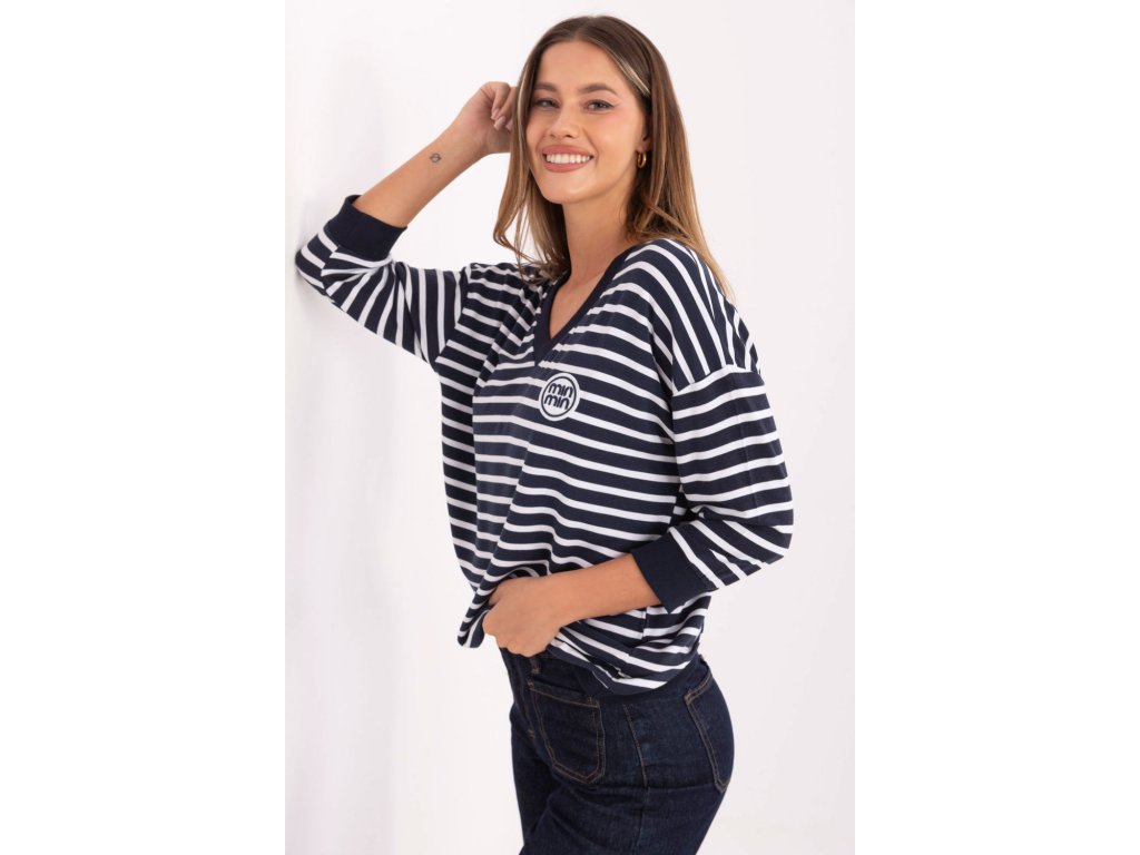 Dámský pruhovaný volný top s nášivkou vpředu je pohodlnou a stylovou volbou pro každodenní příležitosti. Vyrobený z měkkého micro modalu s přídavkem elastanu zajistí pohodlí nošení a volnost pohybu po celý den. Model se standardní délkou rukávů 3/4 a výstřihem do V spojuje klasický střih s moderním detail v podobě nášivky, díky čemuž bude skvěle vypadat v každodenních stylizacích, jak s kalhotami, tak s sukní.