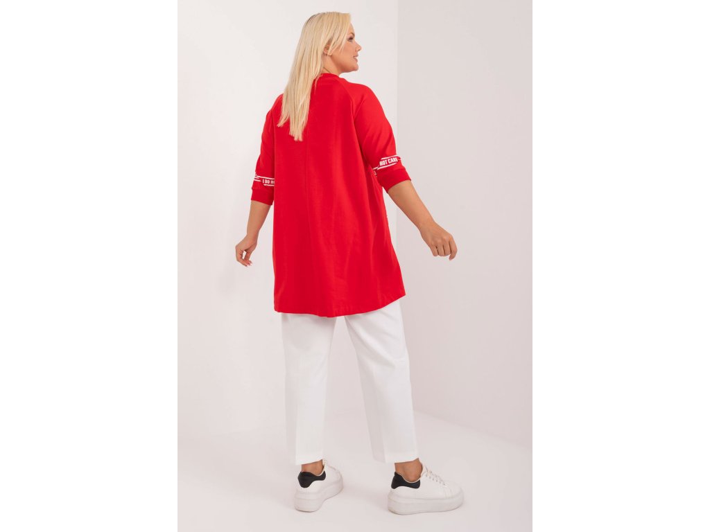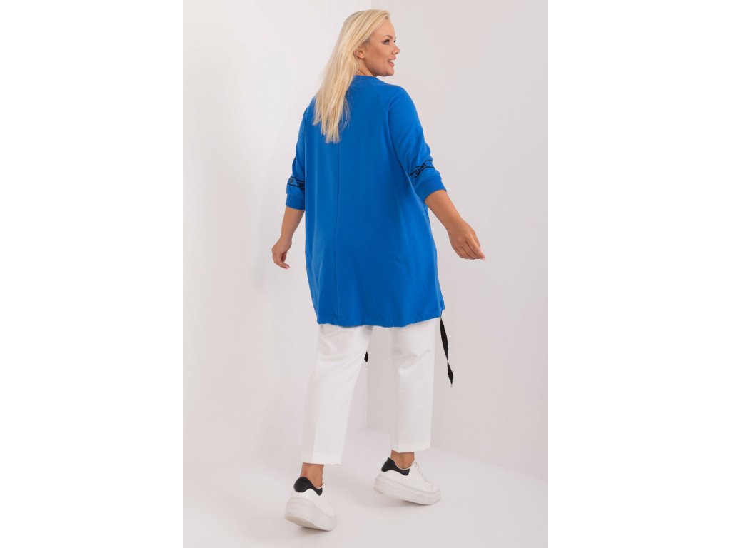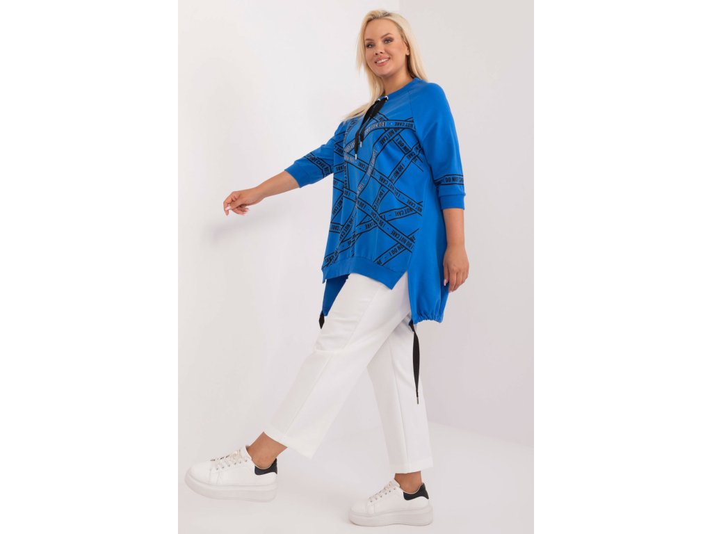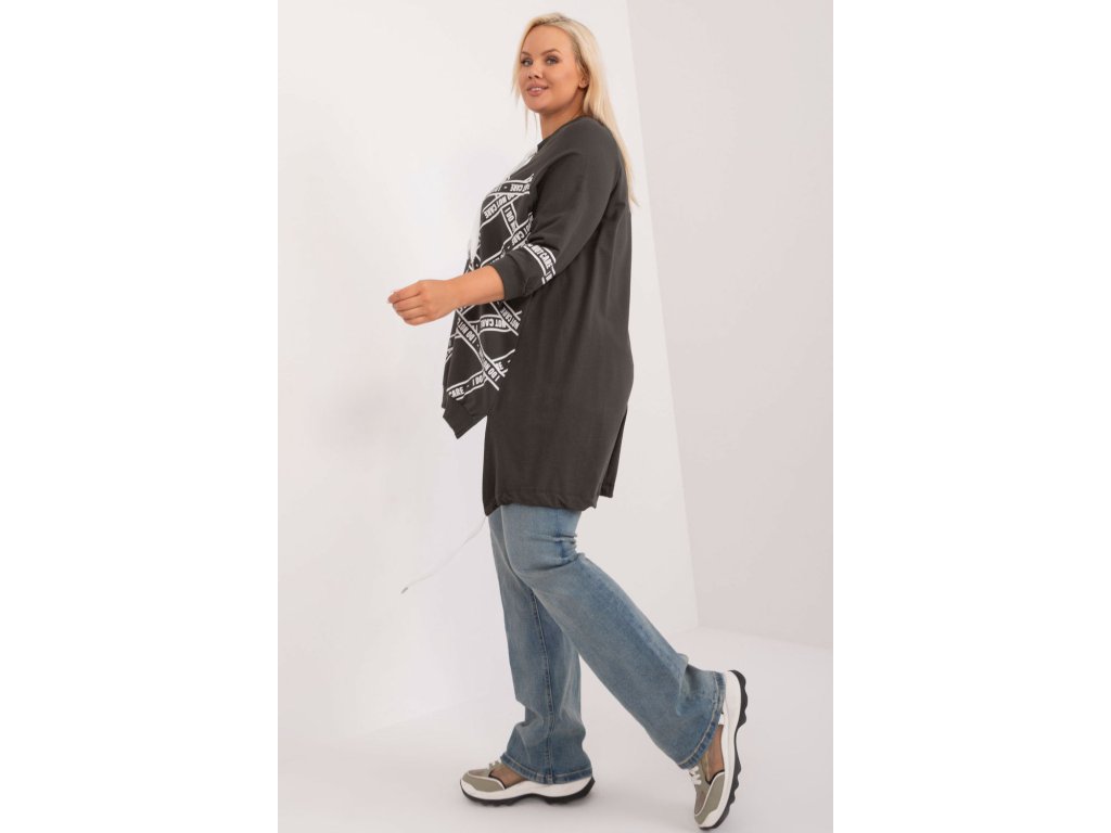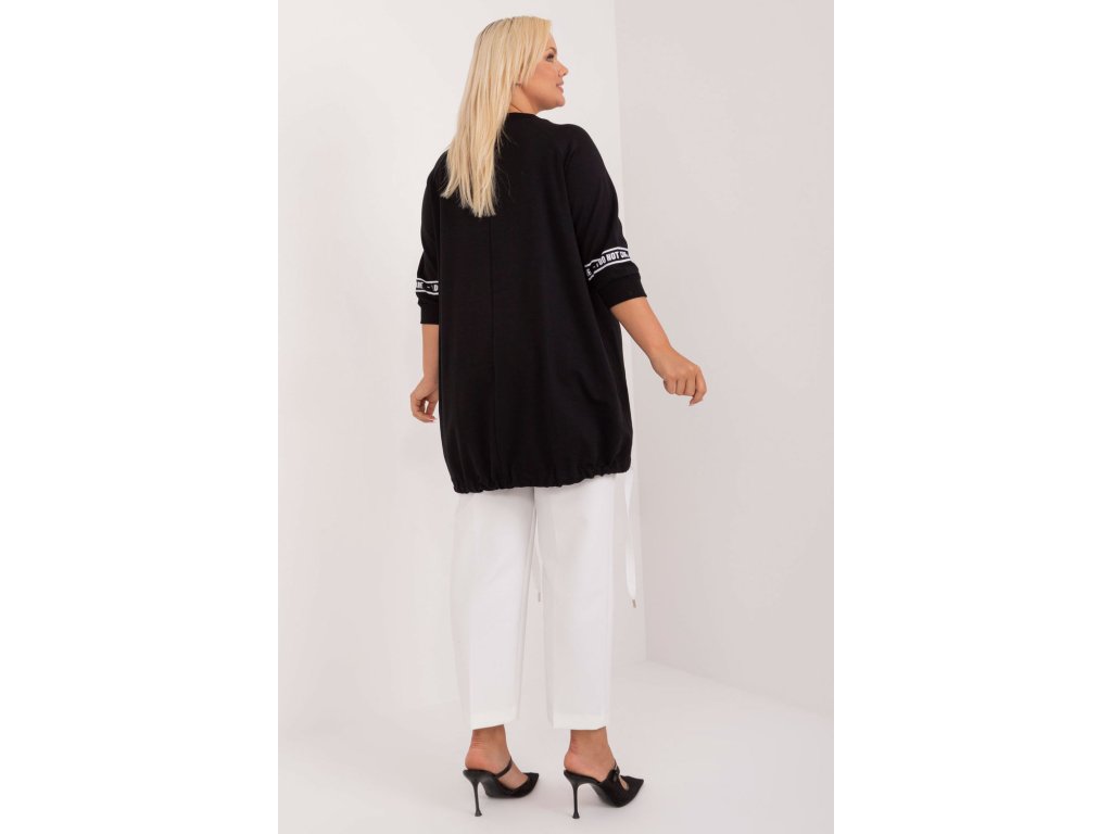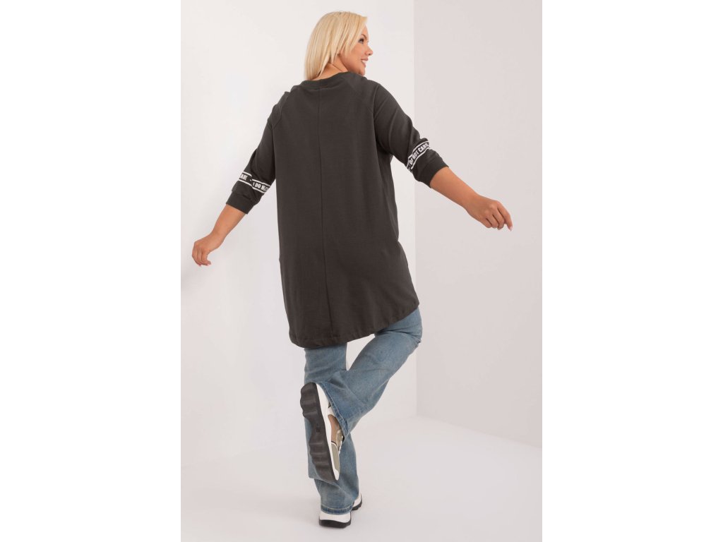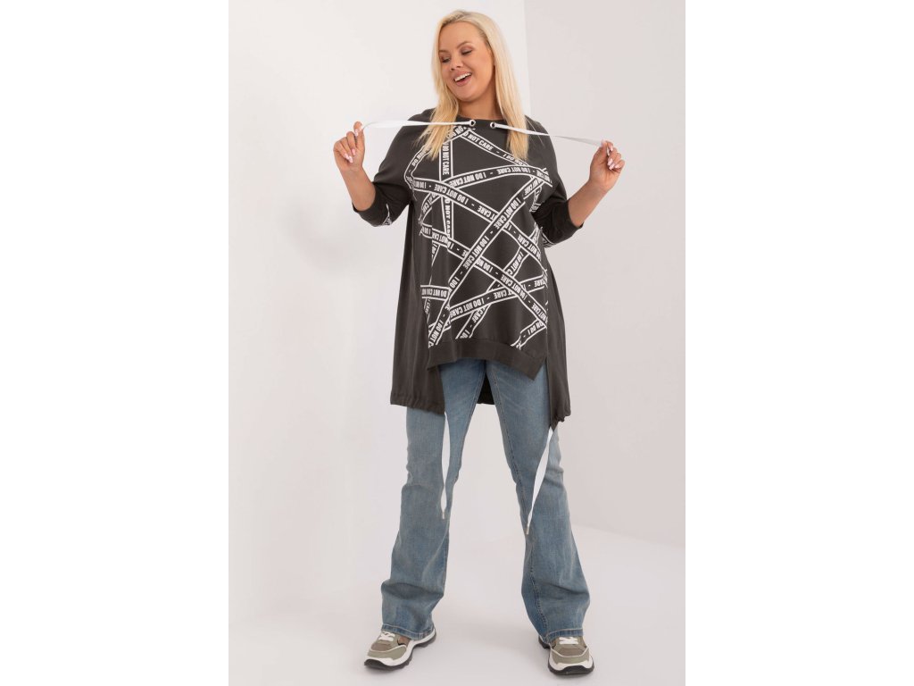 Asymetrická halenka plus size je každodenní kousek s jednoduchým, elegantním střihem, ideální pro každodenní nošení. Je vyrobena z bavlny s přídavkem elastanu, což zaručuje pohodlí a lehký střih. Prodloužený střih a 3/4 rukávy zajišťují volnost pohybu a pohodlí. Halenka má kulatý výstřih, který jí dodává klasický vzhled. Na přední straně je nápis zdobený kamínky, který dodává halence módní a originální charakter. Ideální pro každodenní stylizaci, ať už do práce, nebo na běžné vycházky.