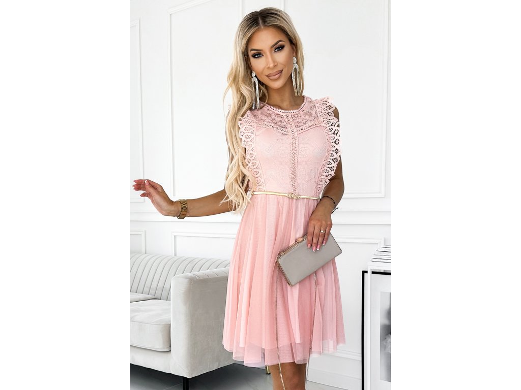 Šaty s krajkovou tylovou sukní a zlatým páskem. Šaty v modré barvě. Značka numoco. Evropská výroba.