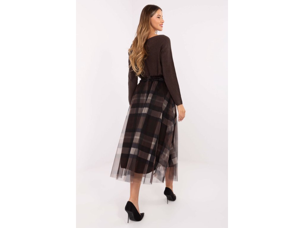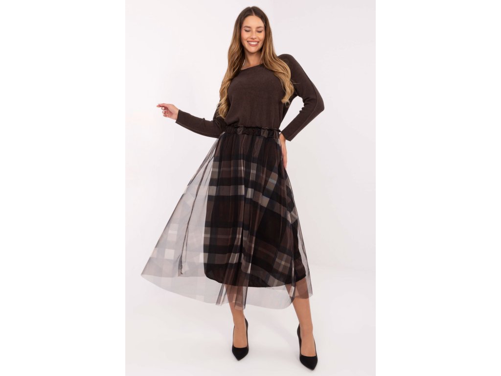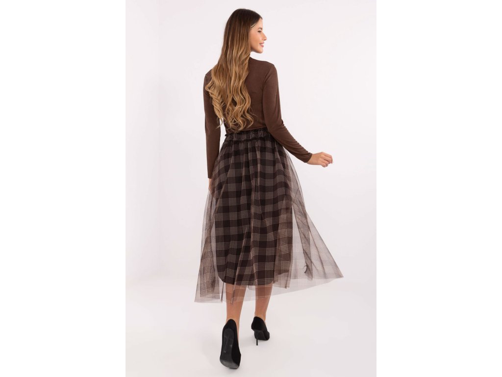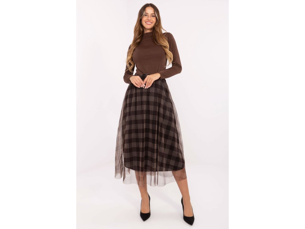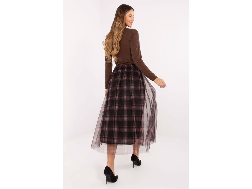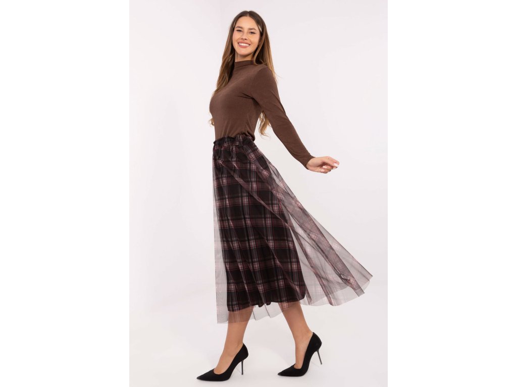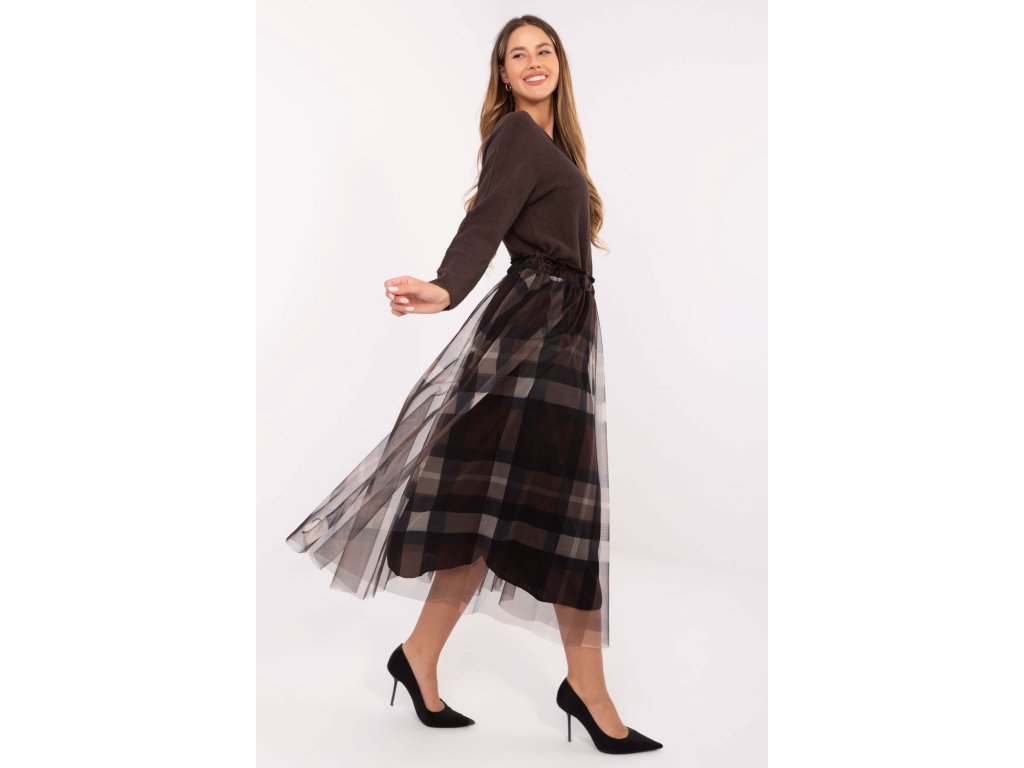 Elegantní sukně z tylu s rozkročeným střihem je spojením elegance a ženského šarmu. Vyrobená z vysoce kvalitní směsi polyesteru a elastanu je lehká, odolná a pohodlná k nošení. Model má podšívku, díky které se skvěle tvaruje a zajišťuje úplné pohodlí. Kostkovaný vzor dodává sukní nadčasový charakter a jemná vrstva tylu jí dodává lehkost a decentní romantiku. V pasu je vsazena gumová část, která usnadňuje oblékání a dokonale přizpůsobuje sukně postavě. Midi sukně se skvěle hodí do elegantních, návštěvních stylizací, stejně jako do více každodenních nebo kancelářských outfitů. Je to ideální volba pro ženy, které si cení stylu, pohodlí a originálního vzhledu.
