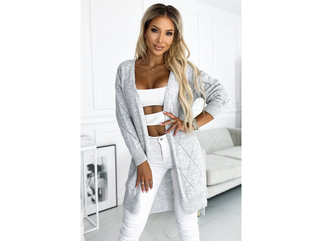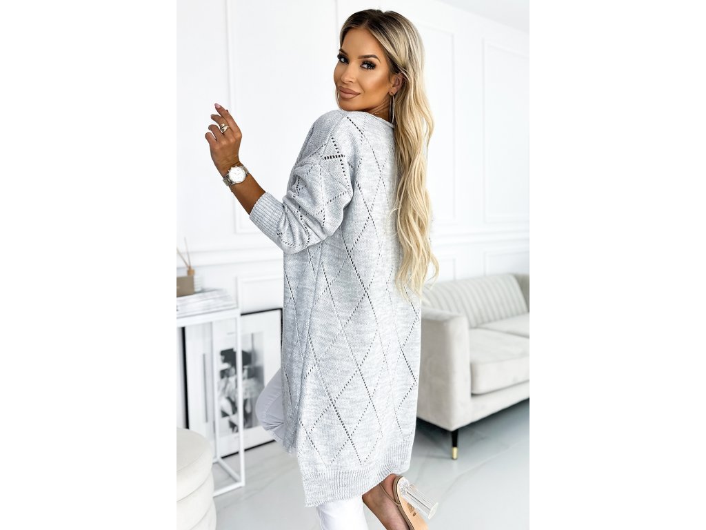 Teplý svetr s prodlouženým zadním dílem. Je vyroben ze svetrové tkaniny s prolamovanými diamanty v šedé barvě. Značka numoco. Evropská výroba.