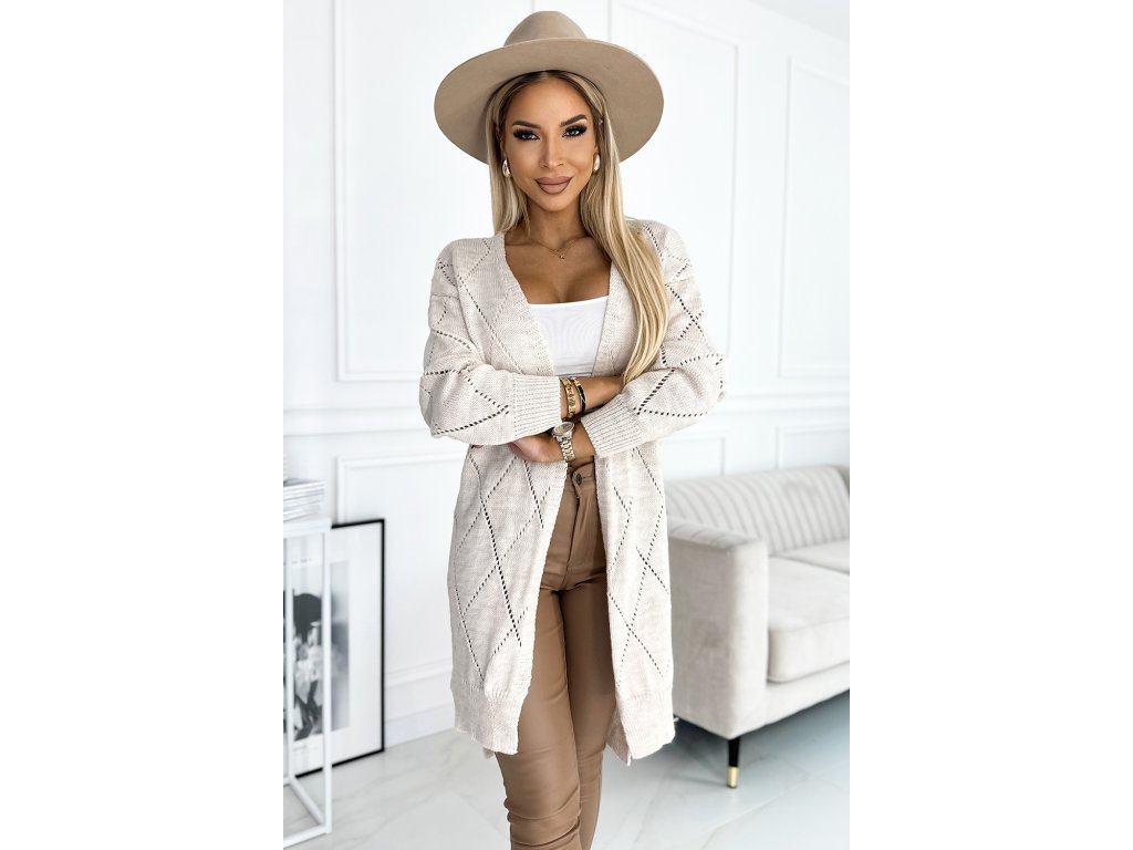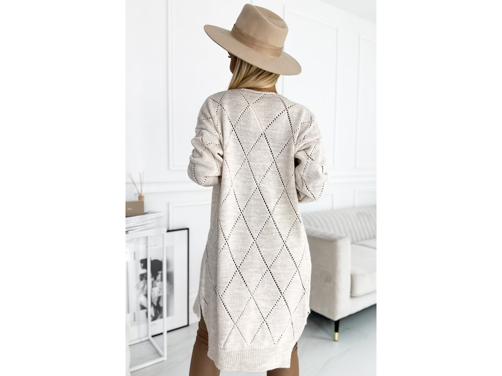 Teplý svetr s prodlouženým zadním dílem. Je vyroben z prolamovaného svetru v béžové barvě. Značka numoco basic. Evropská výroba.
